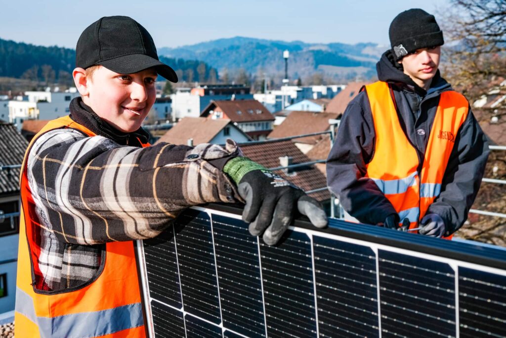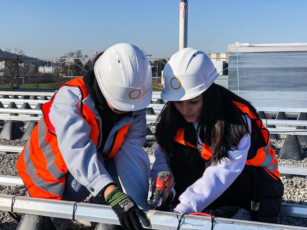 Im Rahmen von zwei Projektwochen rund um die Sonnenenergie schnupperten Jugendliche aus Zürich und Langnau i.E. (BE) Anfang März die Luft der Solarbranche. Zusammen mit Solarfachleuten durften die Oberstufenschüler:innen hoch oben auf einem Dach Solarmodule installieren.