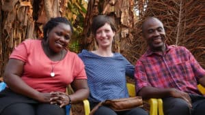 Jolanda Fritschi ist bei Solafrica Verantwortliche für das Programm Klima-Karawane. Im Februar 2017 besuchte sie zwei Gesundheitszentren in Kamerun, in denen SolarChills in Betrieb sind, zusammen mit den Projektmitarbeitenden vor Ort Aline Kana und Serge Moassoumbe (links und rechts im Bild).